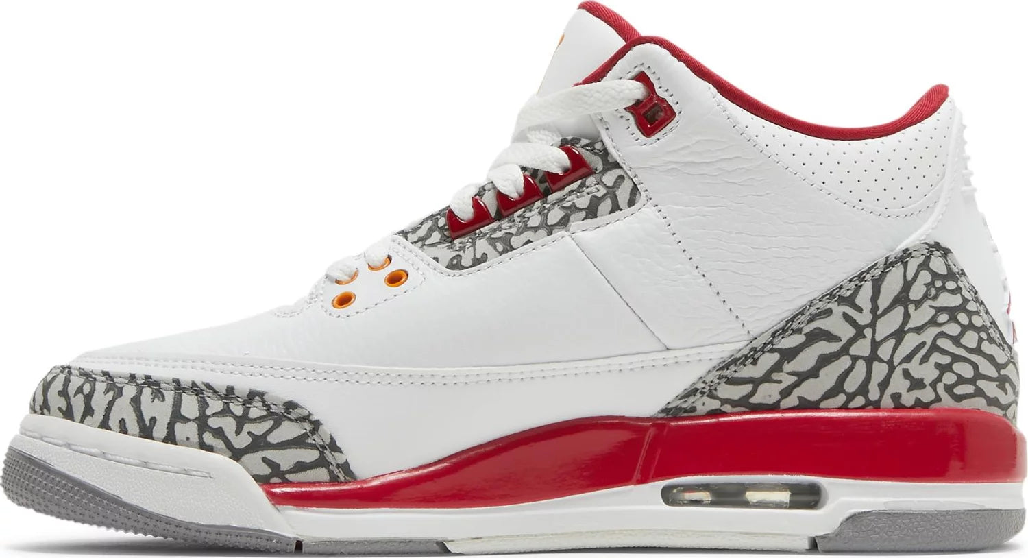 Made for big kids, the Air Jordan 3 Retro GS ‘Cardinal Red’ takes inspiration from an OG colorway of the Air Jordan 7. The mid-top carries a white tumbled leather upper with dark red accents on the eyelets, collar lining, and the raised Jumpman logo that adorns the heel.