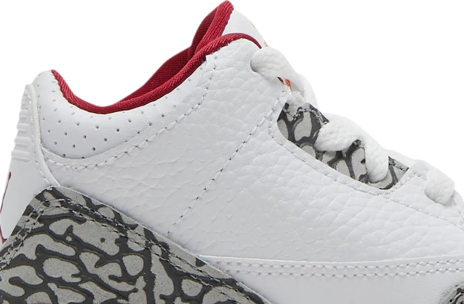 CARDINALS JORDAN 3 ‘PS’, perfect for little kid sizing. Featuring the classic Air Jordan 3 aesthetic with a touch of Air Jordan 7's cardinal red, this shoe guarantees style and comfort. The lightweight two-tone foam midsole and durable rubber outsole ensure lasting support.