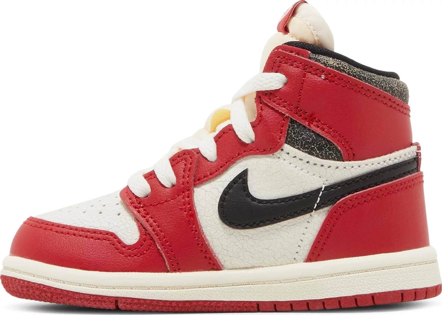 The CHICAGO LOST AND FOUND JORDAN 1 ‘TD’ is a reimagined OG colorway of the iconic silhouette designed for little feet. With a cracked leather construction and vintage aesthetic, this shoe's aged appearance hints at its retrieval from a retailer's lost inventory. Featuring crimson overlays and a black Swoosh, it also offers a traditional cupsole with off-white sidewalls and a red rubber outsole.