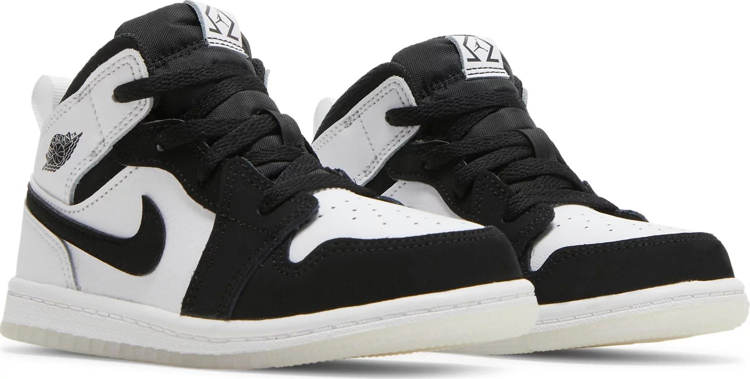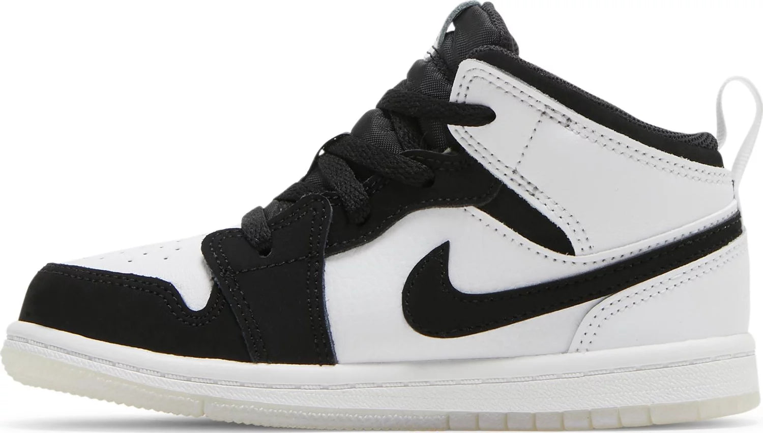 As a product expert, the DIAMOND AIR JORDAN 1 MID SE TD showcases neutral tones on a scaled-down silhouette made for little feet. The white leather upper features black nubuck accents, while the diamond Jumpman logo on the tongue is inspired by Michael Jordan's signature Bulls uniforms. With a translucent rubber outsole, these shoes offer both style and durability.