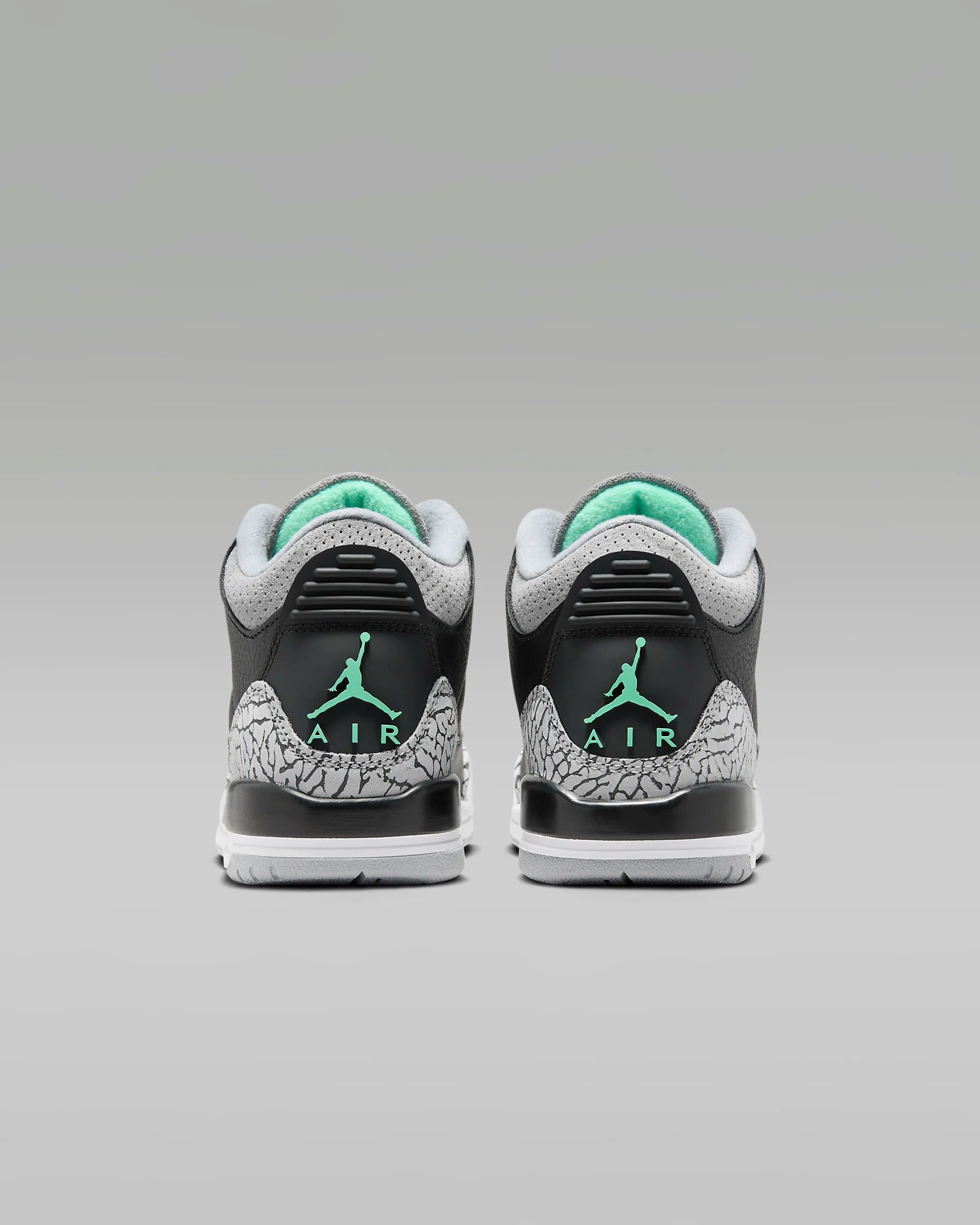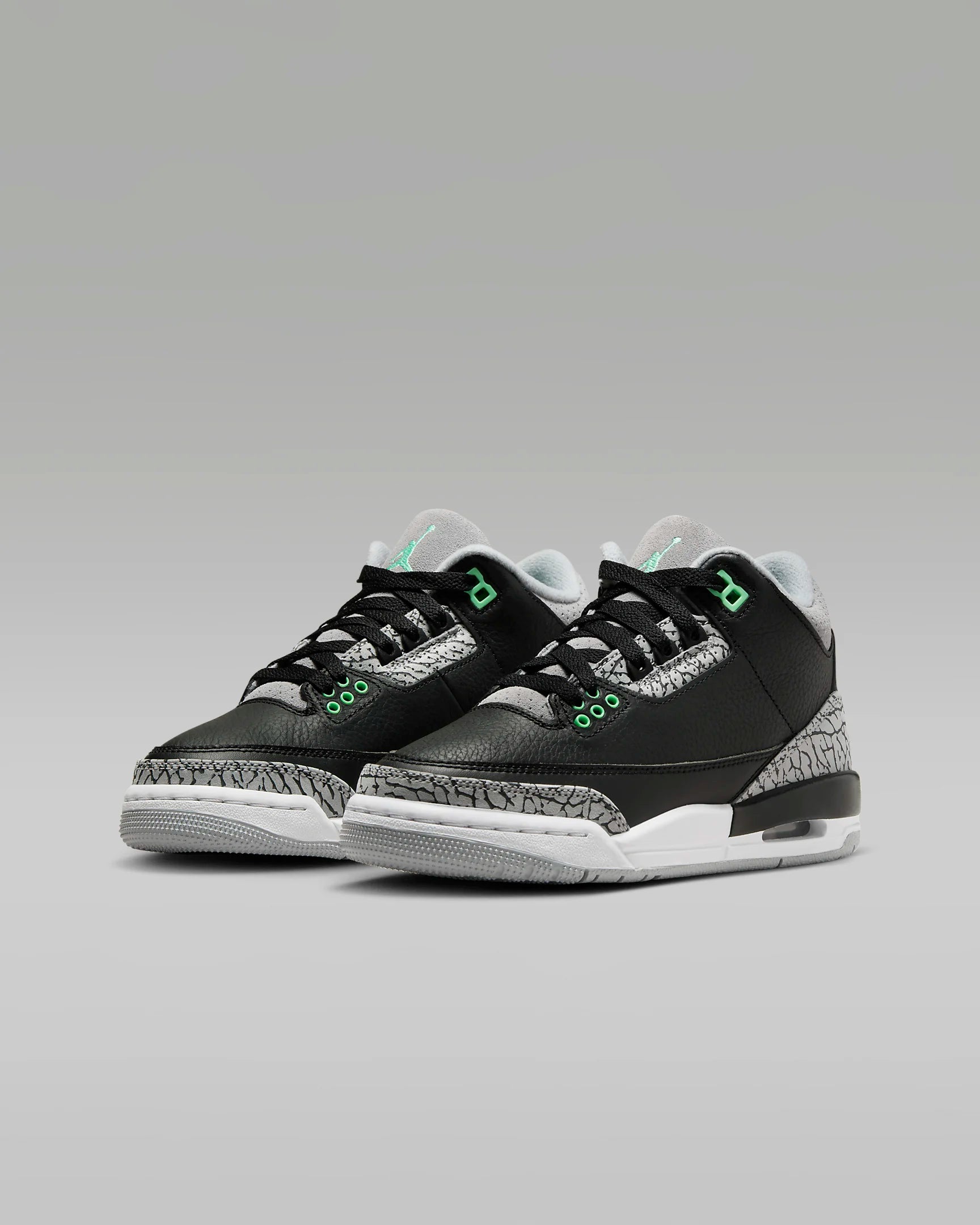 JORDAN 3s "GREEN GLOW". This classic MJ throwback combines cool colors and iconic elephant print leather for a fun, retro look. With a black, wolf grey, white, and green glow colorway, steps out in style and makes a statement.