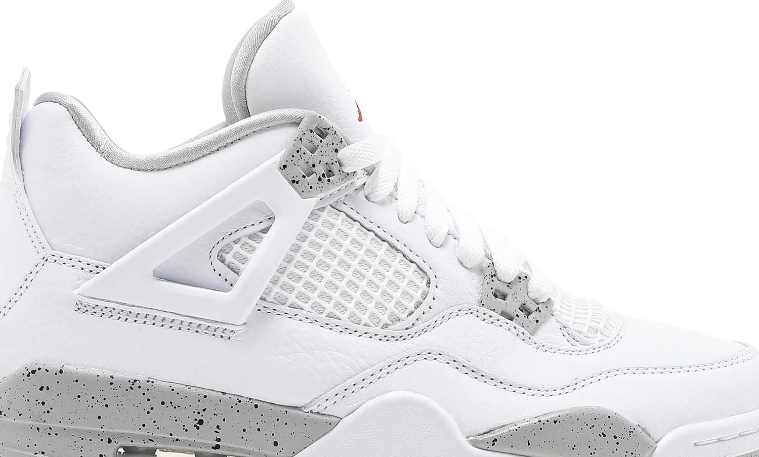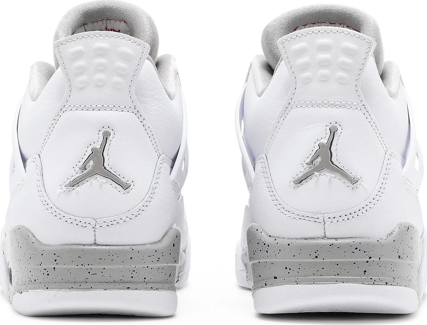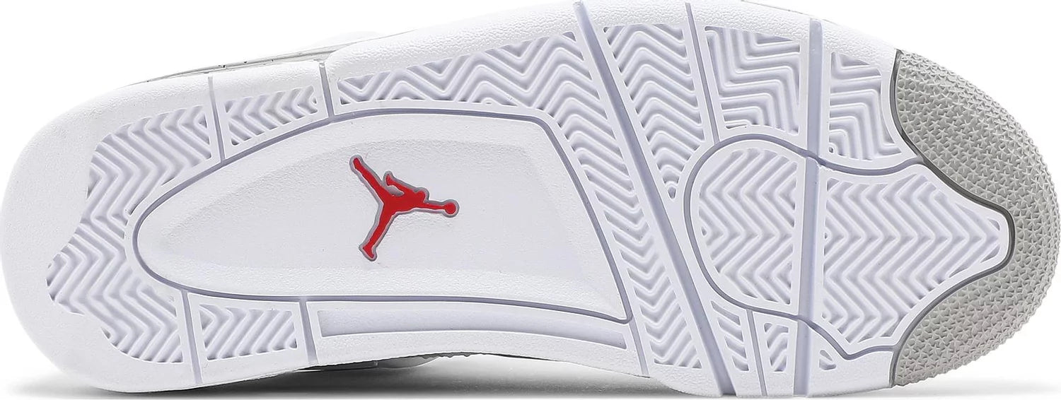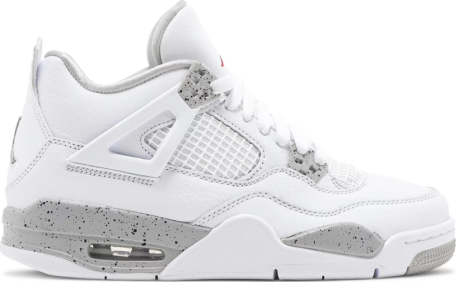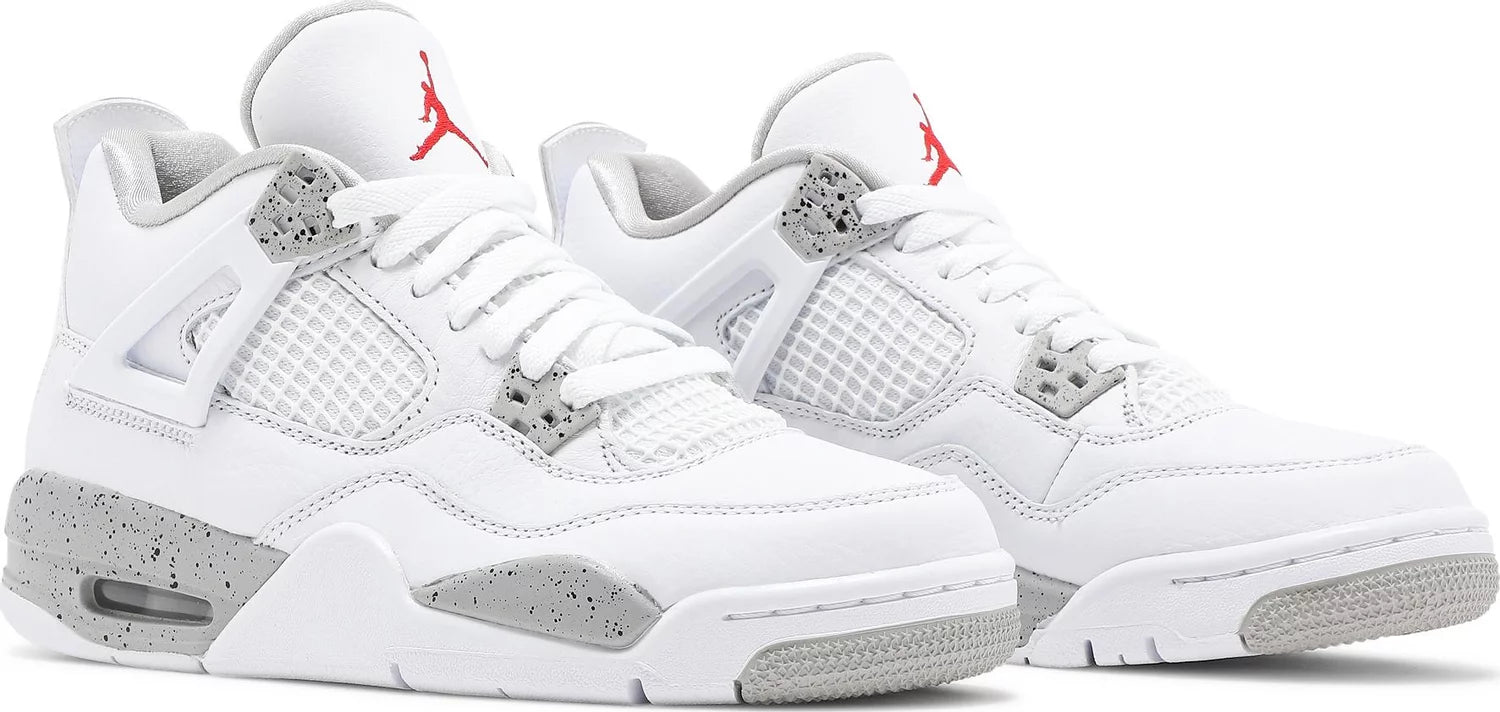Air Jordan 4 Retro GS ‘White Oreo’. Made with premium white tumbled leather, showcasing grey Jumpman branding and black speckled detailing on the foam midsole and molded eyelets. Featuring an embroidered Fire Red Jumpman icon on the tongue for a bold contrast. Own a piece of basketball history with this refined colorway of MJ's iconic '89 Playoffs shoe.