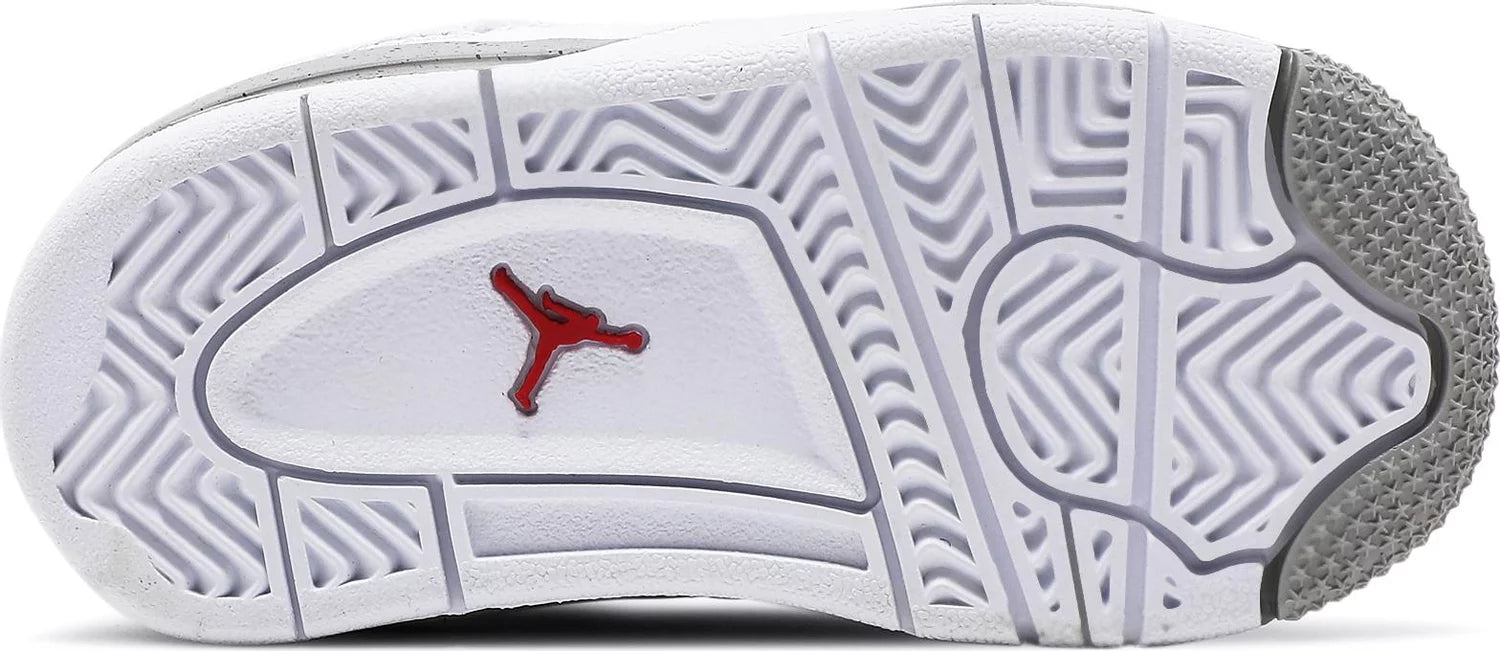 Air Jordan 4 Retro GS ‘White Oreo’. Made with premium white tumbled leather, showcasing grey Jumpman branding and black speckled detailing on the foam midsole and molded eyelets. Featuring an embroidered Fire Red Jumpman icon on the tongue for a bold contrast. Own a piece of basketball history with this refined colorway of MJ's iconic '89 Playoffs shoe.